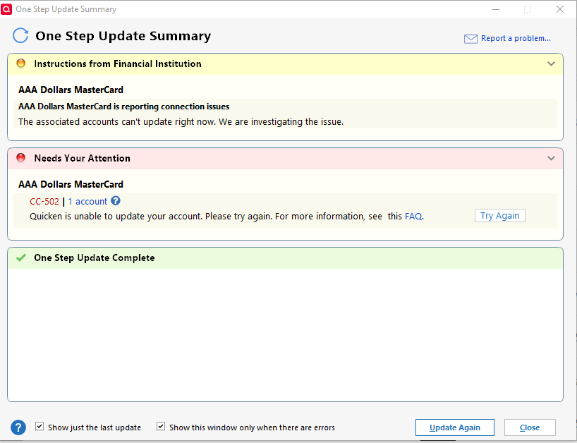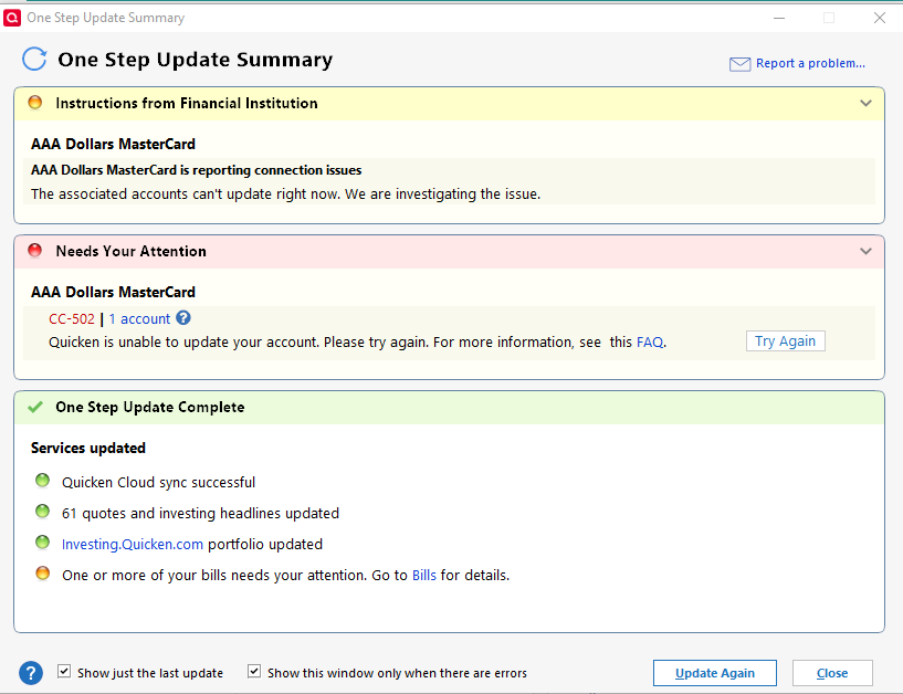 In preparation for your call to Quicken, you can go to Help>Report a problem and submit your log files, as they will be needed for further escalation.