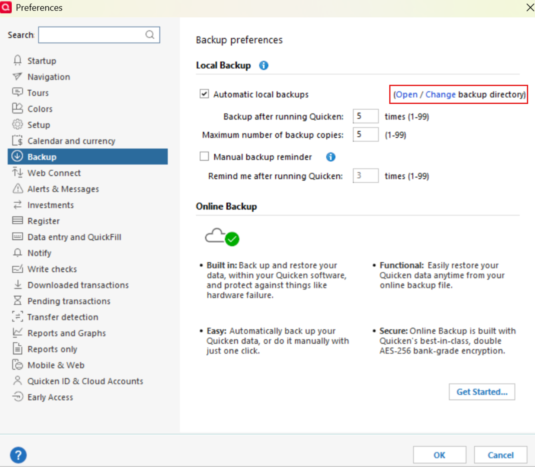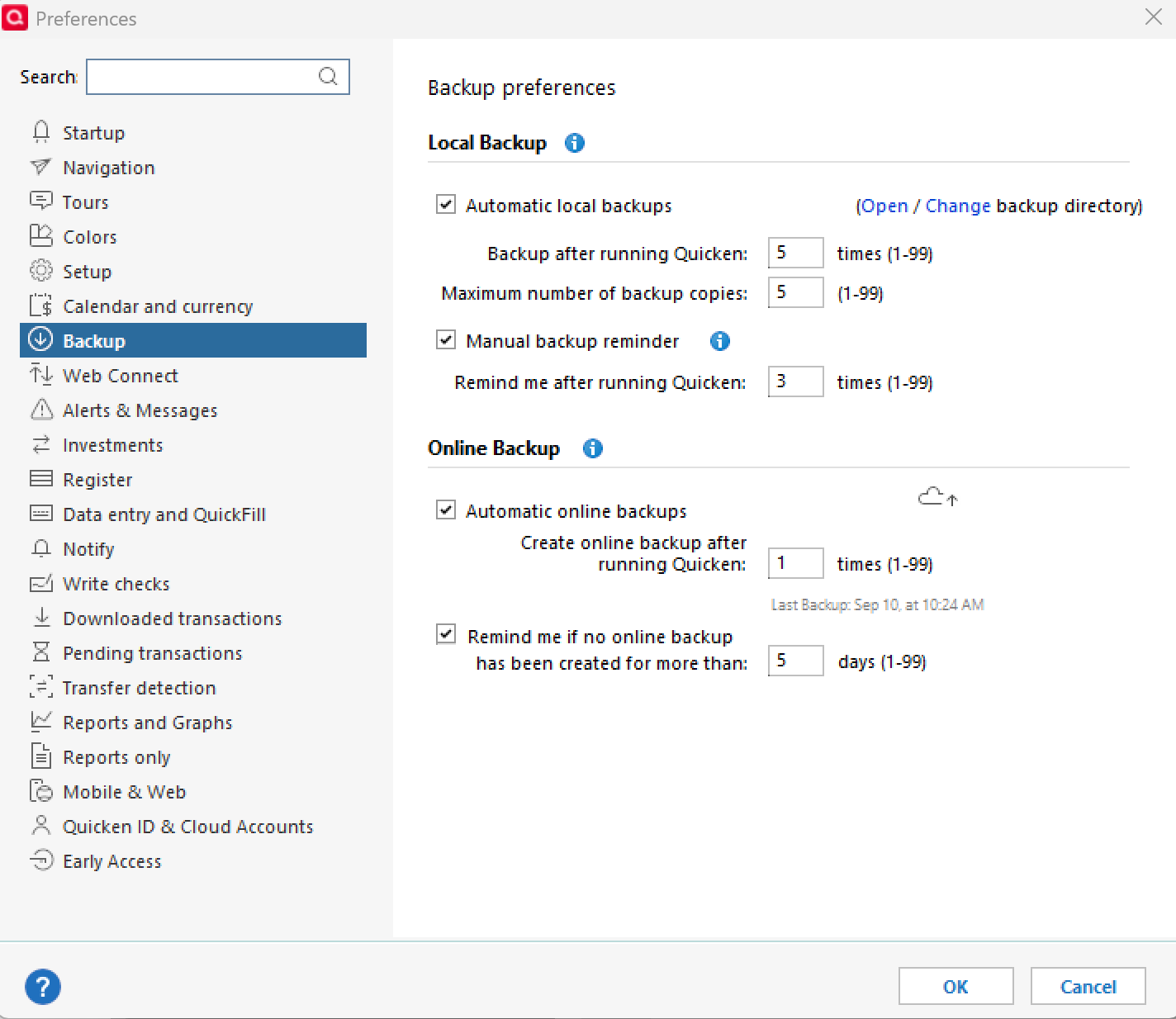 - A screenshot of your backup settings in Quicken, which you can find by going to Edit > Preferences > Backup.