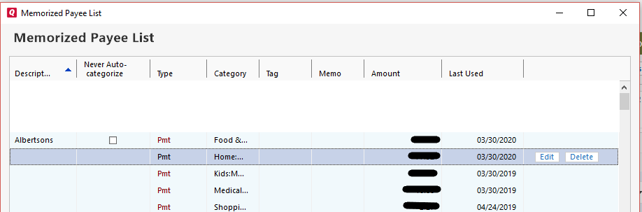 - Check if the payee has multiple lines with different categories assigned (for example, a payee like “Albertsons” could have 5 lines with different categories).