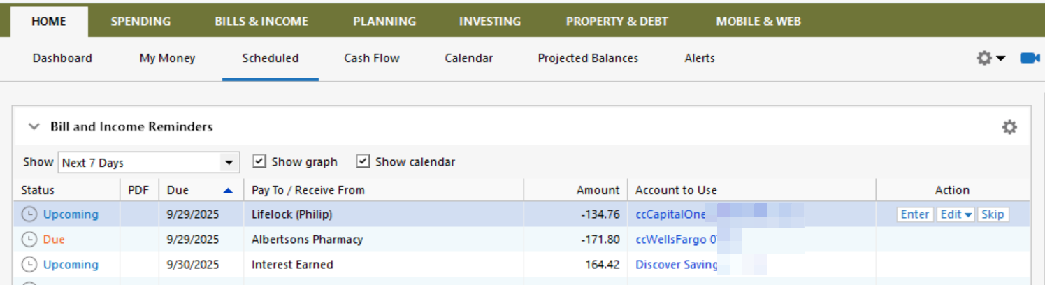 I have a Home Tab customized view that is showing the Bill & Income Reminders component. This component is a different view than what's found on other displays of these Reminders, and it is lacking some key column fields.