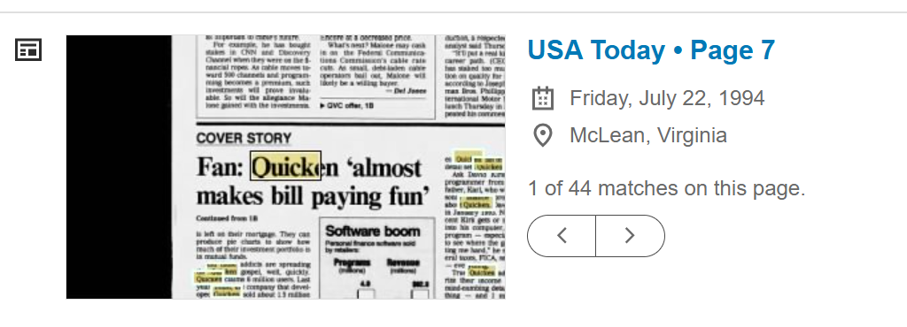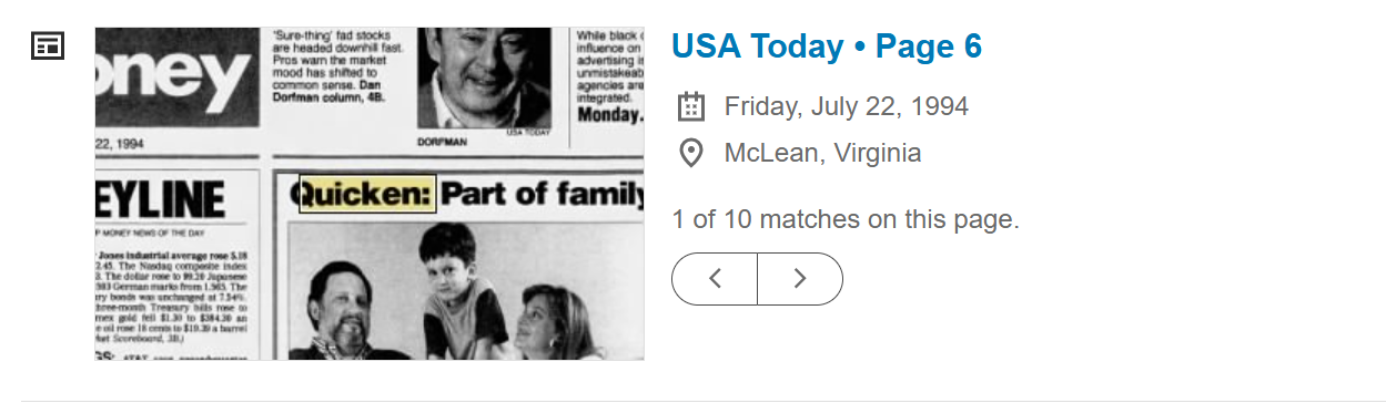 On July 22, 1994 USA Today published an article about Quicken on the front page of their Money section. Along with the article was a photo of a computer screen with Quicken on it, surrounded by me and my family. And now we finally get to the purpose of this too long post.