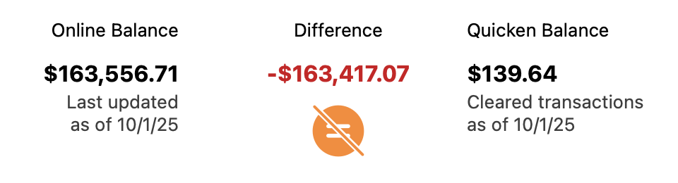 • Issue is with Schwab brokerage accounts (Schwab BANK accounts are fine) and is that Quicken is displaying the Market Value as the Online Balance during reconciliation. Prior to today/this update the Online Balance was the cash in the account. Thus now the Difference shown in reconciliation is the amount of all the stocks in the account or hundreds of thousands of dollars off.