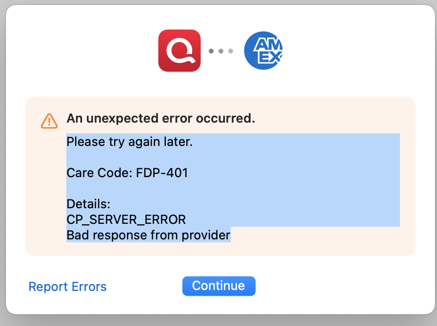 Strange. I got it to work a couple times after disconnecting the Amex account and then reconnecting, but then the last few days I've been getting the same "unable to connect to American Express" error FDP-401.