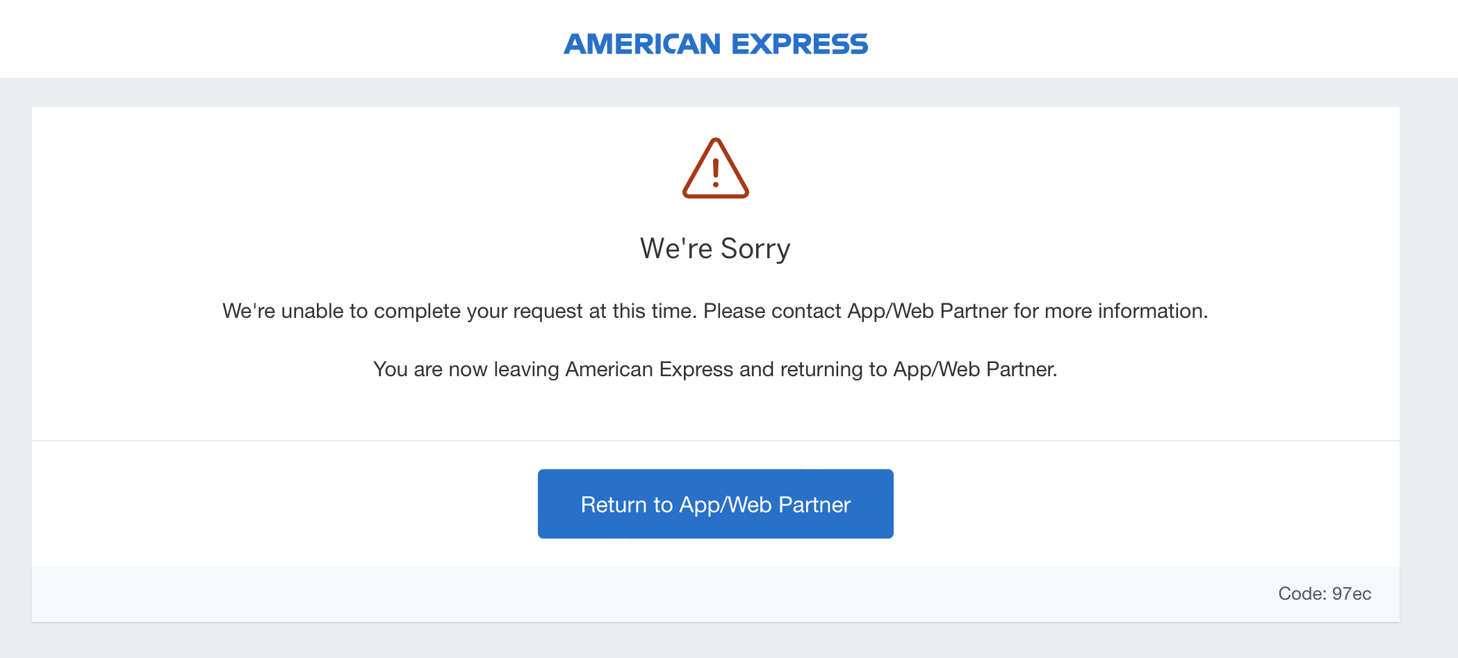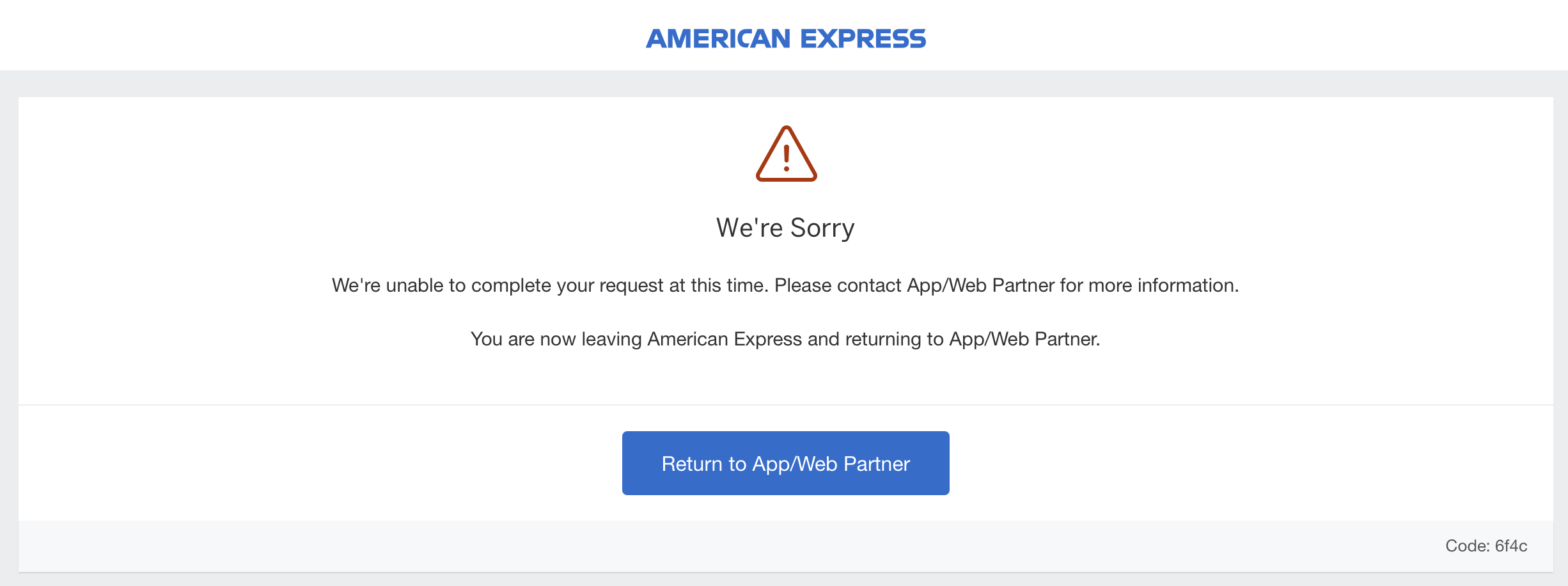 When it opens the URL in the browser, I get an American Express banner with a blank page below. If I refresh the page, I get a prompt to log in. But after logging in, they tell me there's a problem and to contact the app/partner. There's a code: Cf4c.