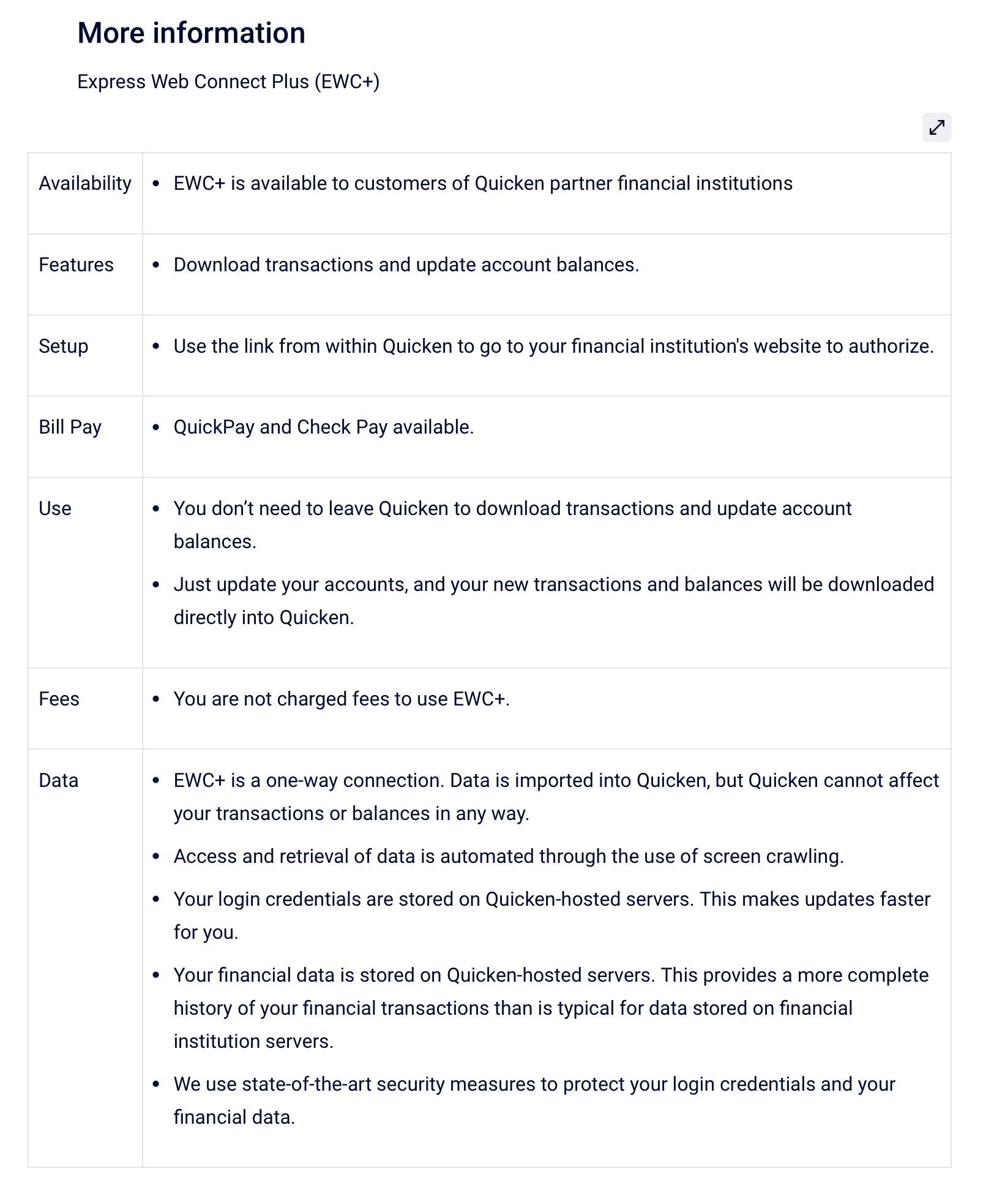 Does ExpressWebConnect+ require storing your financial information with Quicken???