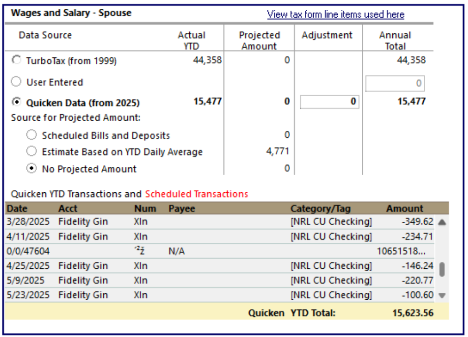 There was an scheduled salary input into the checking account for my wife that somehow was corrupted/deleted. Not sure when this happened, I only noticed in the past week. It left a faulty entry in tax planner for 401K that I can not examine or delete. See below.