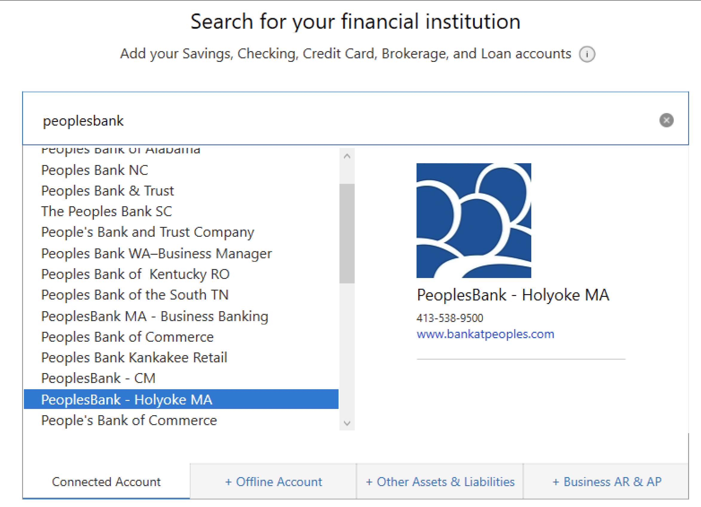 I'm trying to set up online access for an account at PeoplesBank, Holyoke, MA. The bank appears in Quicken's "Search for your financial institution" list, and when I select it I'm taken to the next screen asking for consent to access my data. Clicking on that takes me to the next screen, which defaults to "Checking— add your offline account," with no other options offered.
