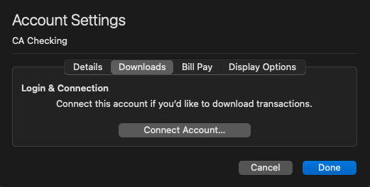 If you are no longer seeing the error message, and the issue is that nothing is updating, then I recommend verifying that the account is still connected to the financial institution. You can do this by clicking on the account to select it, then navigating to Accounts>Settings…. In the window that comes up, click on the Downloads tab. If the account is connected, it should show the financial institution name and the connection method.