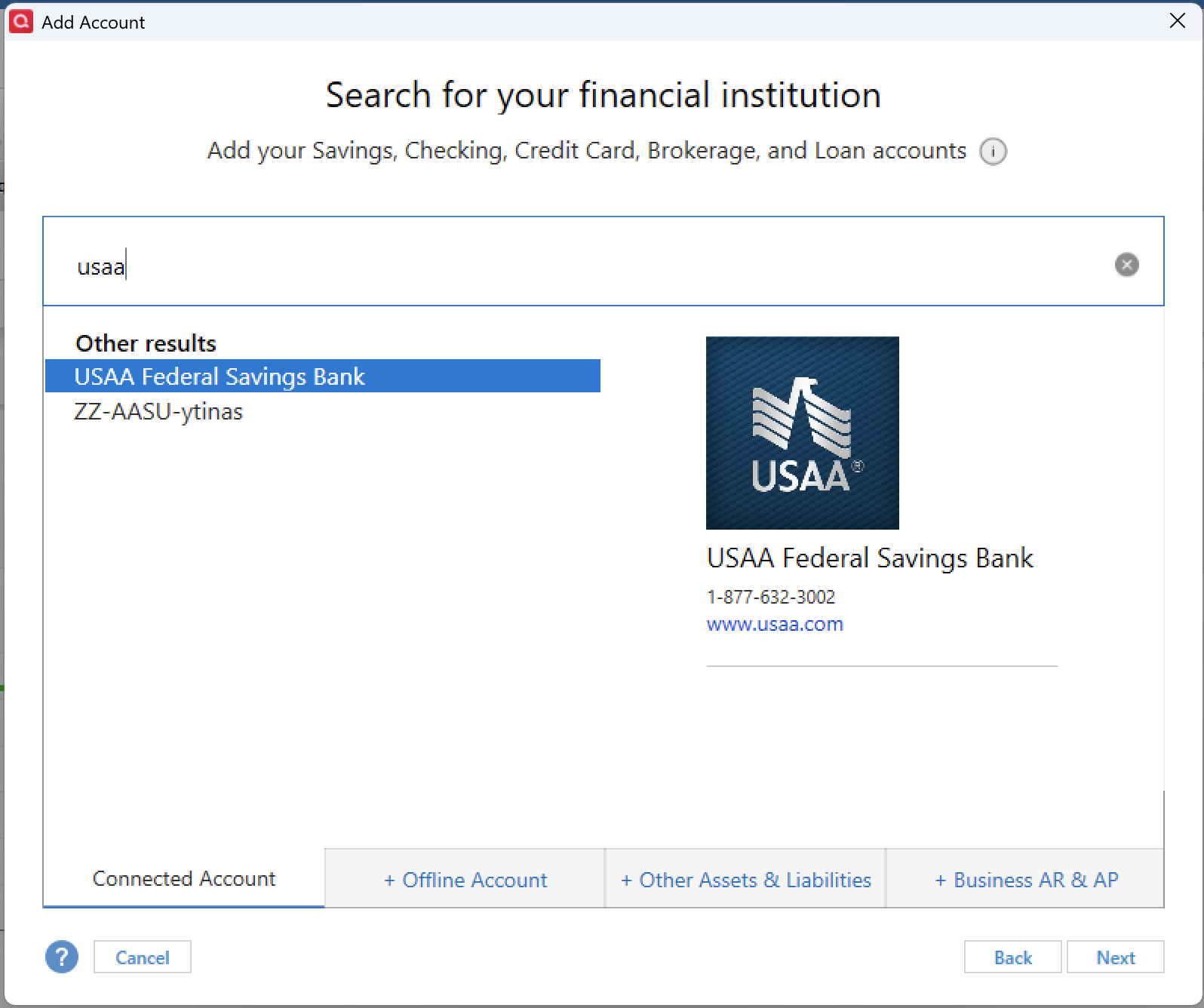 When you try connecting to the USAA Federal Savings Bank instance in Quicken, what happens?