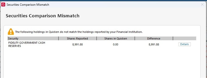 My IRA account is reporting properly in Quicken with the "Cash Balance". But I am occasionally getting the following mismatch message.