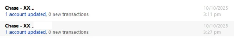 I have 2 Chase Visa cards linked, a Southwest Visa and a Sapphire Preferred Visa. The Southwest Visa stopped downloading transactions after 9/24 which the Sapphire continues to download all transactions. No error messages in