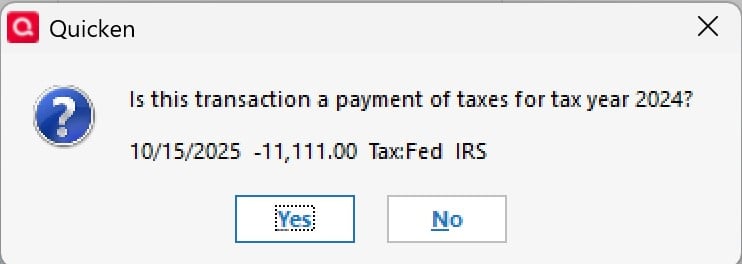 I'm running Quicken Classic Deluxe on a Windows 11 platform. I set up categories over a year ago to track self employment expenditures. Each time I enter tax information when paying estimated taxes, I get a popup questioning, "Is this transaction a payment of taxes for tax year 2024". I was originally thinking this might stop a few months into 2025. That is not the case. It's now October 2025 and I'm still getting the same popup.
