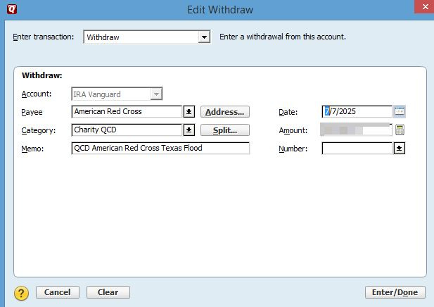 If this has already been asked and answered, I apologize. I didn't see any recent posts. The issue of taking an RMD and showing the taxable transfer has been fixed. These show as "WithdrwX" in the register and works great. This year, I made a couple of QCD's. I'm not sure how to show them. I tried doing just a withdraw. It shows as "Withdrw" in the register. This did not show on the tax planner as taxable income. I tried writing a check in the IRA account. It shows as "Writechk" in the register. Again, this did not show on the tax planner as taxable income. The IRA account does show Transfer Out as "1099-R Total IRA Taxable Distribution". Do I need to go back and 1st withdraw and transfer the money to a dummy account?