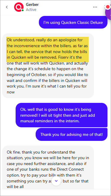 So essentially @Quicken Alyssa your reps are now lying to customers. I was told that you all were removing this awful update. Why are we paying higher subscription fees for less service and fewer supported billers? Seriously! This is quite mind-boggling to be honest. And no, I'm not restoring a backup because it broke when said update was rolled out. Here's a screenshot of said conversation: