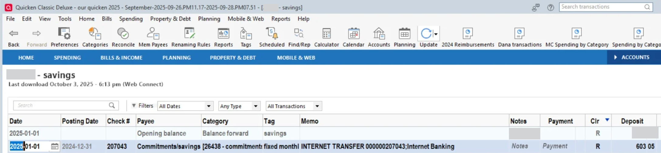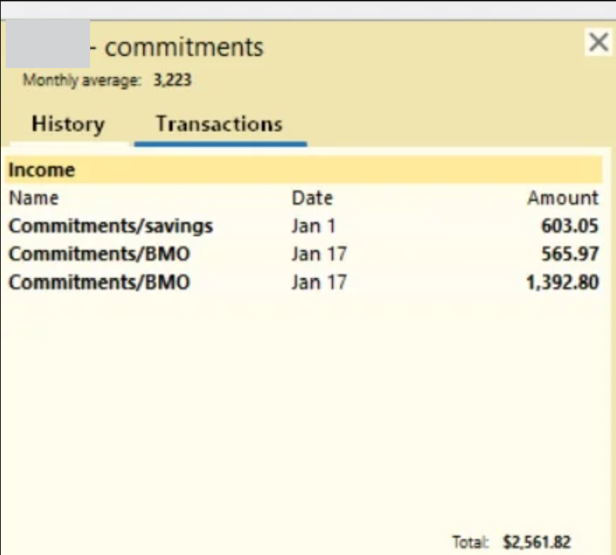 I'm using the Canadian version of Classic for Windows. I have several accounts for different purposes. I often transfer funds from Commitments to Savings. In the example below, I am transferring '$603.05 from commitments to savings. However, in the savings budget, the amount shows as $2,561.82. Clicking on this amount, I see that it is the total of three transactions in commitments. What can I do so that the budget only shows the $603.05 transaction?