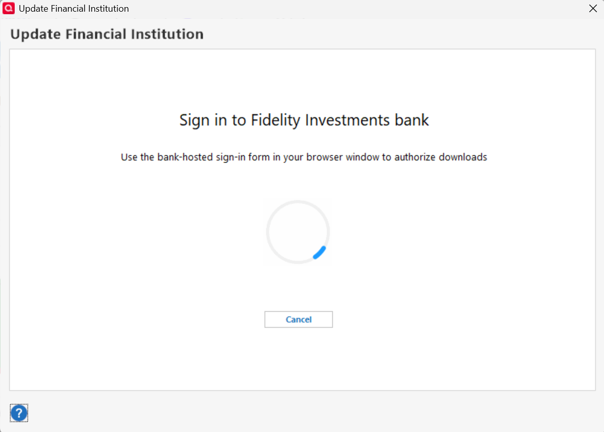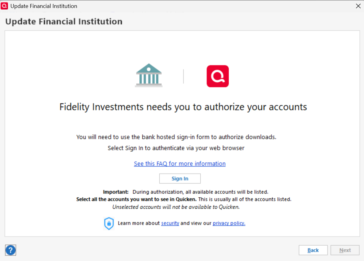 4. Sometimes Quicken gets an error connecting to Fidelity so I assume I now have to reauthorize. When I click Reauthorize, I get this screen telling me I have to log in to Fidelity on my browser
