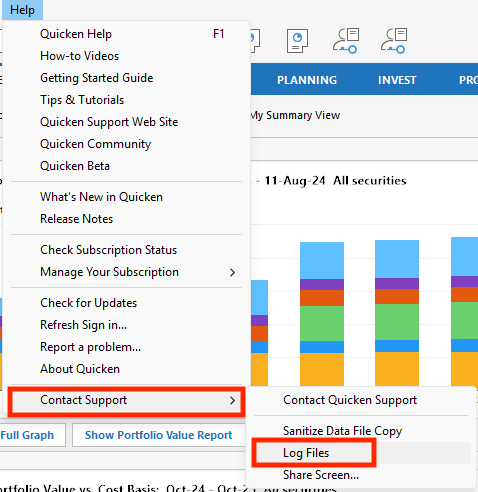 If you want to review log files in your Quicken, you can do so by navigating to Help>Contact Support>Log Files.