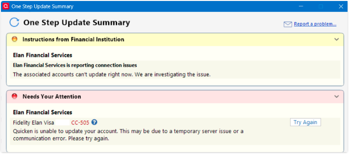 - CC-505 - Quicken is unable to update your accounts. This may be due to a temporary server issue or a communication error. Please try again. (under wife's login)