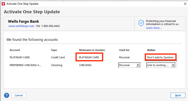 Thank you for reaching out! When the Add/Link screen shows Don't add to Quicken, and offers no option to switch it, that means Quicken sees the account as already connected. It should tell you the account name Quicken sees the account connected to in the Nickname in Quicken column.