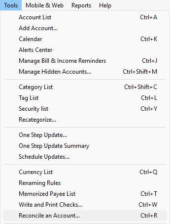 When you're in the account, are you able to use Ctrl + R to start a reconcile? If you have access to the menu options at the top, are you able to go to Tools>Reconcile an Account…?