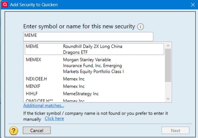 If you attempt to Add a security, enter the Ticker as MEME, you get this: