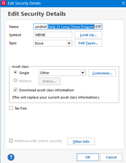 The ETF symbol "MEME" has an incorrect description in the Quicken data when I entered it as an investment today. This ETF was launched October 7th 2025. Quicken lists it as "Roundhill Daily 2X Long China Dragons ETF". This is incorrect. The correct title is "Roundhill Meme Stock ETF" per the link provided below. How does Quicken make corrections for this type of error?