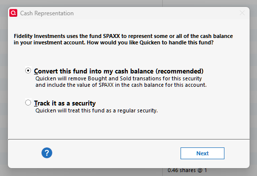 - Quicken did not ask me to convert SPAXX into my cash balance. Instead, it told me it did it for me automatically.
