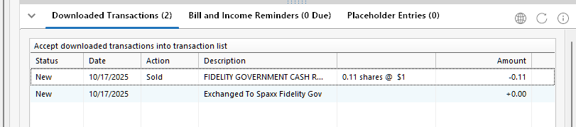 - Two transactions were downloaded for each of the accounts. I manually deleted the first (SOLD) transaction. I kept the second $0.00 transaction and added a memo to document the core position change.