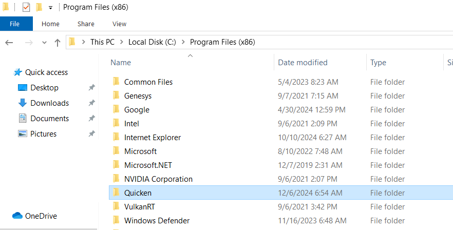 Regarding your uninstall/reinstall: you mentioned you’ve already tried this—can you clarify exactly what steps you took? For best results, after uninstalling Quicken, open Windows File Explorer and go to This PC > C: Drive > Program Files (x86), then delete the folder titled “Quicken” (this does not affect your data files).