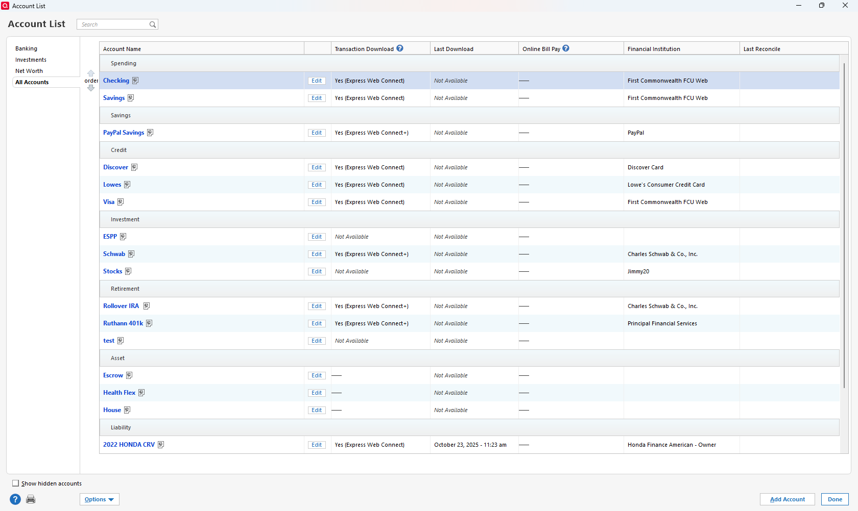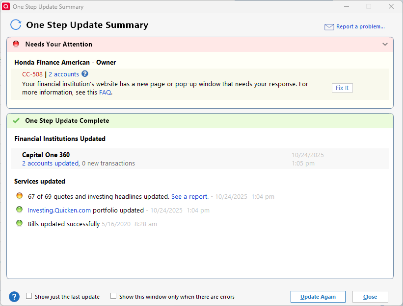 This started last week - my credit union ( First Commonwealth Fed CU) is no longer updating. Also I noticed that in one step update summary very few of my accounts showed - see screenshots below showing the one step update summary and the list of accounts. Disregard the Honda message.