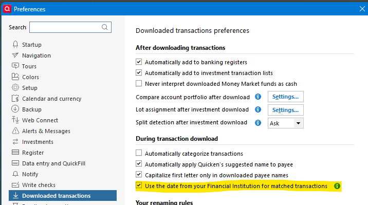 However, it would appear to me that the date shown in Quicken registers was based on the fact that, prior to EWC and EWC+, the only date available to Quicken from downloads was posted date (or supposedly posted date). But with EWC and EWC+ there is something that comes with the downloads that is, alledgedly, the transaction date. Given that both transaction date and posted date are available in the downloads, it does not make any sense to me to not make transaction date somehow available for display.