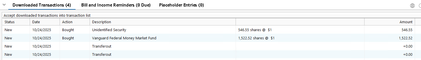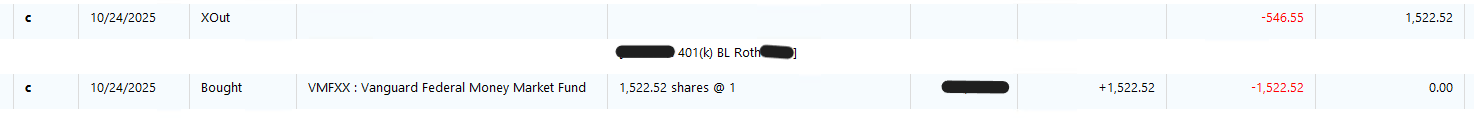 The Transferout transactions with DC used to have a Memo such as "TRANSFER;VANG VMMR-FED MMKT OQQL;as of 07/18/2025" indicating a Roth in-plan conversion (website had more info), but now they're useless as the Memo is empty and the amount is zero, so I delete them.
