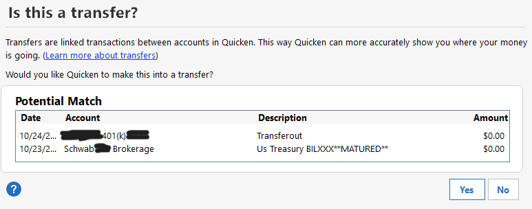 Seems to me Quicken should not be trying to make a zero amount transaction into a transfer. So I said No. Here's the register: