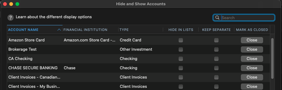 Once you have done that, navigate to Accounts>Hide and Show Accounts…, and check for any hidden USAA accounts that may still be connected. To see if Quicken thinks the account is connected, check to see if a financial institution is listed in the Financial Institution column.