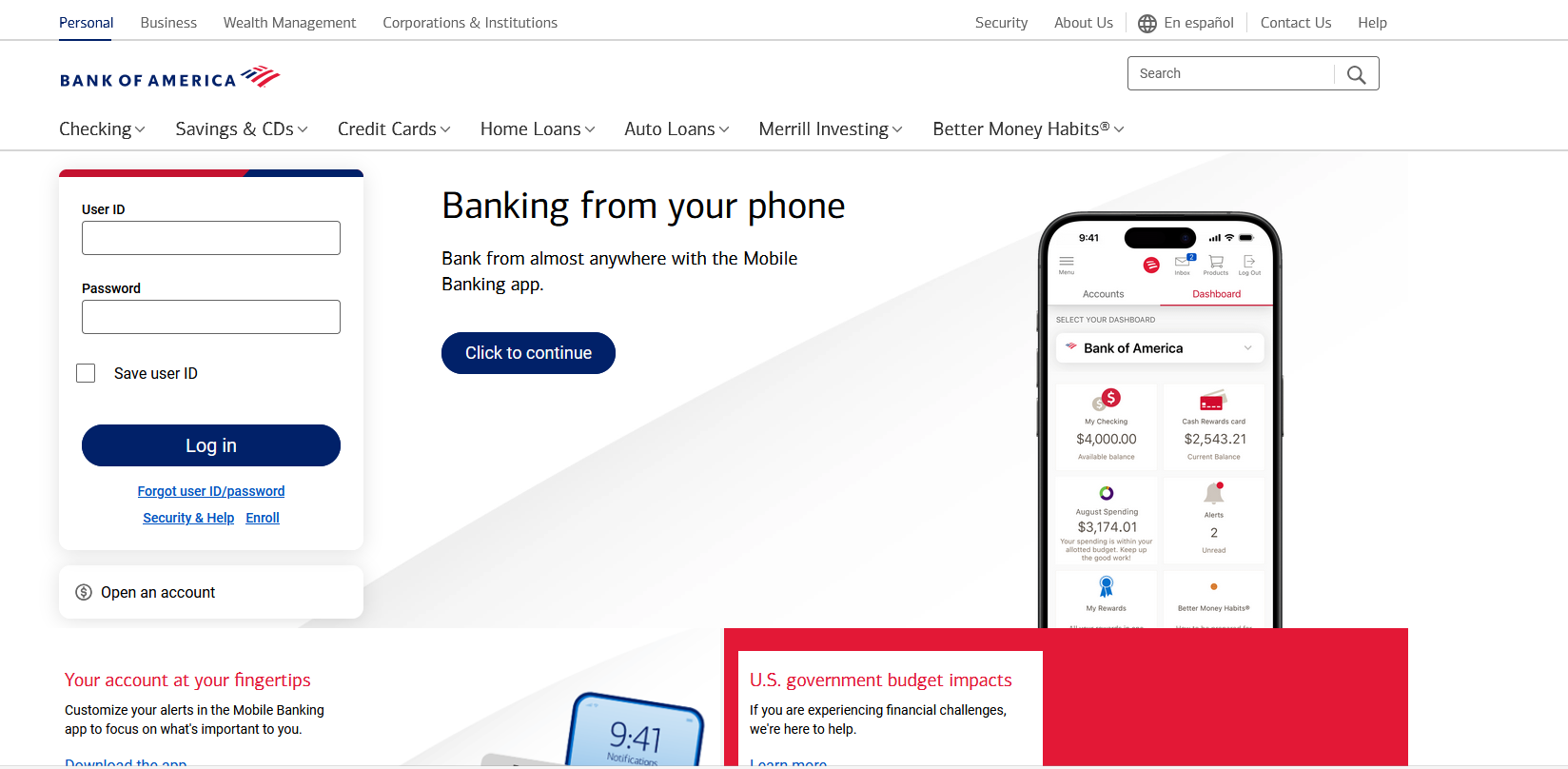 The path I took was to open my browser, type bankofamerica.com into the URL box and this came up: