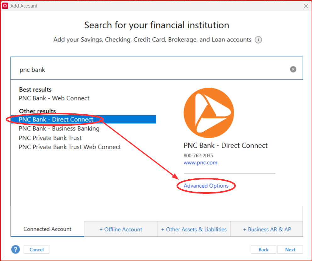 You need to select PNC Bank - Direct Connect in Add Account.