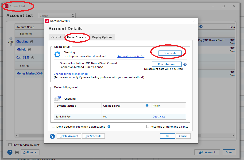I did the deactivate/reactivate thing for my PNC accounts a couple of times and after the second time my downloads now seem to be accurate. But, now I have lost the ability to pay bills online from my PNC checking account through Quicken. I have about 30 online payees already set up, but when I click on the online center with my PNC account, no payees show up for that account. All I see is a transactions tab. All of my existing payees now are associated with my Fifth Third checking account — but until this mess started, I never used my Fifth Third account for online payments via Quicken. I can't figure out how to get my payees back to being associated with my PNC checking account. Has anyone else experienced this problem? Does anyone have a fix for it?