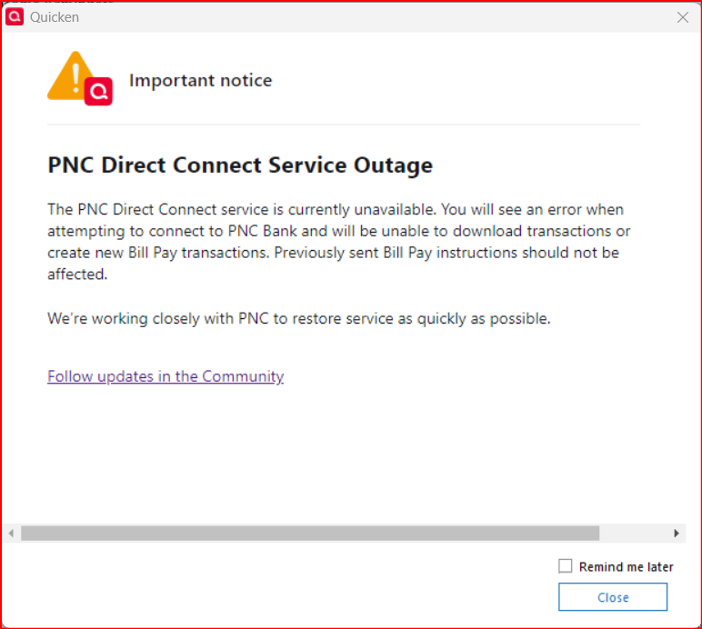 Follow-up to my post of 11/5/2025: Upon launching Quicken and open my primary data file today I got this following popup confirming that PNC and Quicken are working together to resolve the issue.