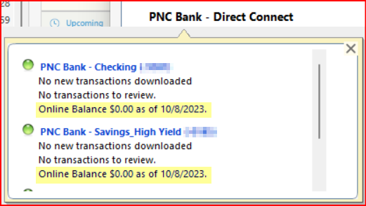 - OSU SUMMARY: Clicking on the blue font number of accounts updated beneath PNC Bank - Direct Connect (on the left side of the OSU Summary) shows $0.00 online balance for 10/8/2023 (wrong date) for each of my 3 accounts.
