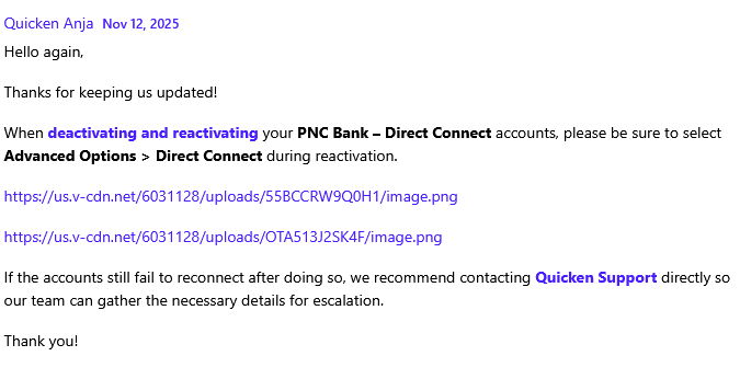 As of 11/12/25, 8pm, after reauthorizing earlier in the day, direct connect seemed to jump to life. Downloads of transactions. However, there seemed to be DUPLICATE recurring transactions that were deleted from my account months ago suddenly appeared. Five separate duplicate recurring payments appeared. Manually deleted and PNC seemed to accept the deletions. Made a test payment to Amex and upon upload, a lightning bolt and check number appeared.
