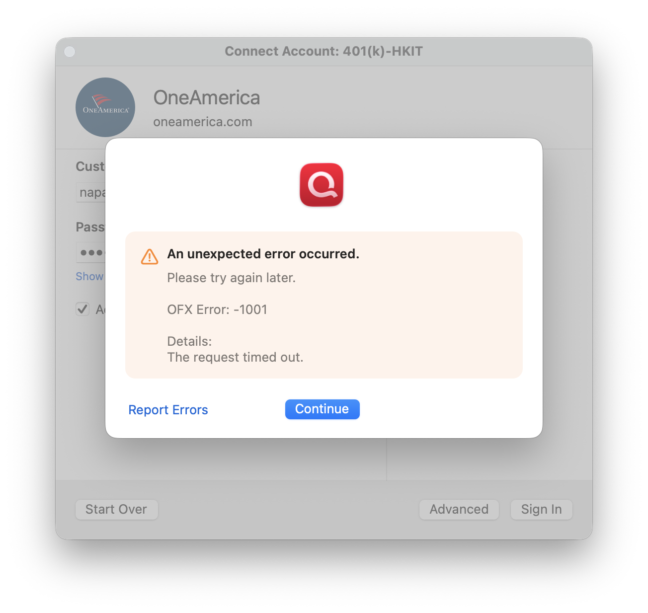 New guy here - navigated to this thread b/c I'm having the same issues w/OneAmerica. Been happening for at least a few weeks now (maybe months?) but I'd been putting off taking care of it. Previously I'd been getting error 16503, but then I disconnected the acct, and now that I've tried to reconnect it, I'm now getting -1001.