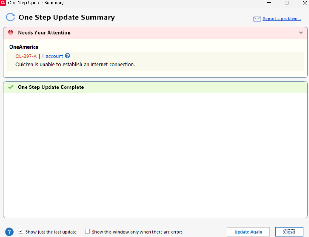 The error I am receiving is: OL-297-A. Quicken is unable to establish an internet connection.