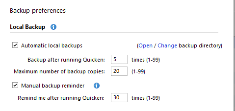 I have automatic local backups configured with the 'maximum number of backup copies' set to 20. Today I have 39 regular automatic backups and 6 backups that are created when the Quicken application is updated. So how is Quicken using my setting of 20? Is the setting ignored?