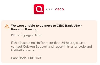 Related to CIBC US - Since Monday, October 27 when I attempt to update 5 accounts in Quicken I receive "We were unable to connect to CIBC Bank USA - Personal Banking Care Code: FDP-163"