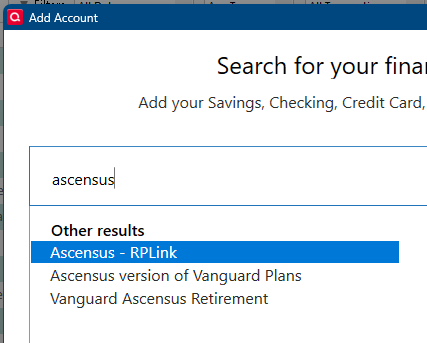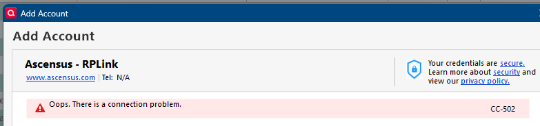 My company has just stood up a 401K plan which is administered by Ascensus. I can login to my Ascensus account on their website. When attempting to add the account to Quicken, I tried all three (see attached) of the Ascensus options because I had no clue which one I should use. None would connect and all three result in a CC-502 error (see attached).