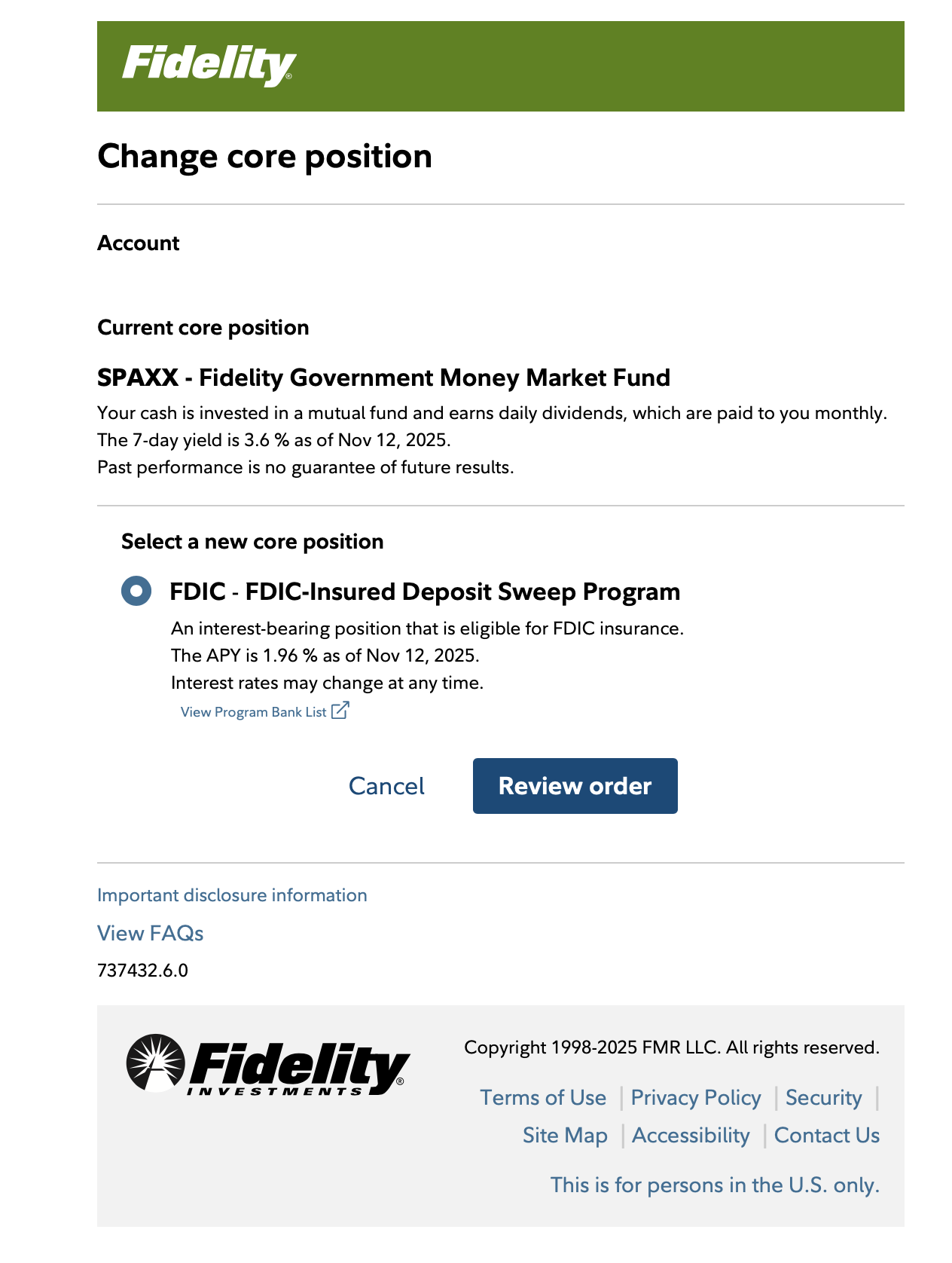 For my Cash Management account, Fidelity only offers SPAXX or FDIC as options for the Core position.