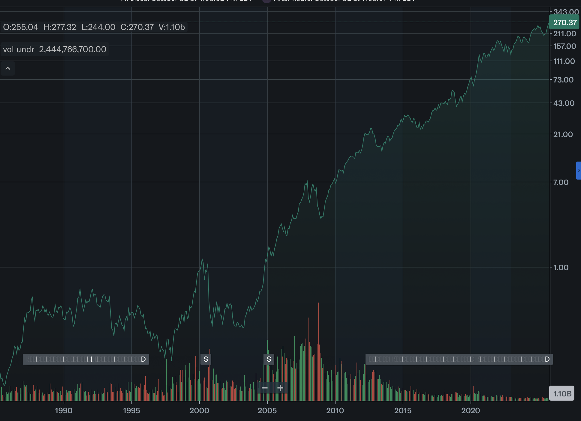 This keeps coming up but going nowhere: how can we request a logarithmic plot on investment plots? The log plot below (upper) is so much more illustrative than the linear plot (lower) for long-term investments.