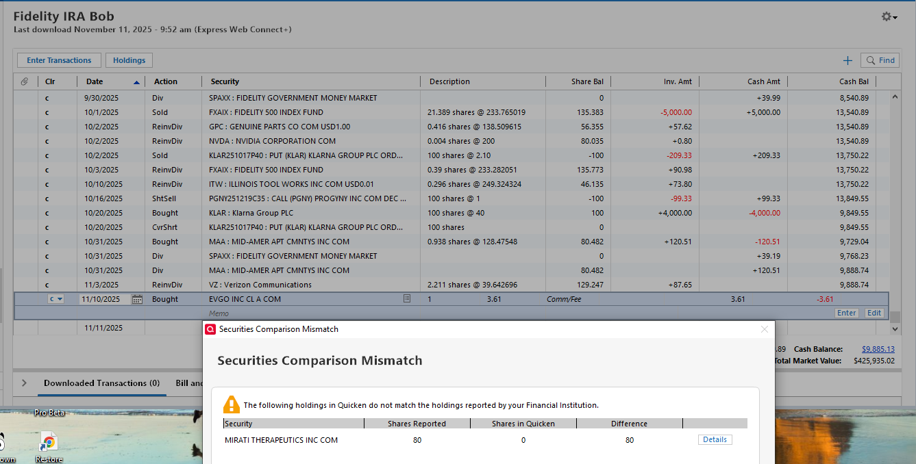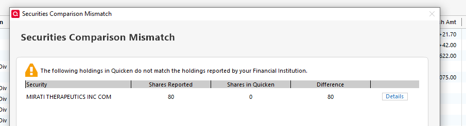 I click Accept All, that transaction applies correctly, and yes, the Mirati Therapeutics "Securities Comparison Mismatch" pops up. So Quicken check and finds this mismatch any time any share count changes in this account. And again, Mirati is no longer a public company. There is no public stock with that name. Zero shares in Quicken is correct. It's the Shares Reported that is wrong, and that only started being wrong after I did my Fidelity reauth.