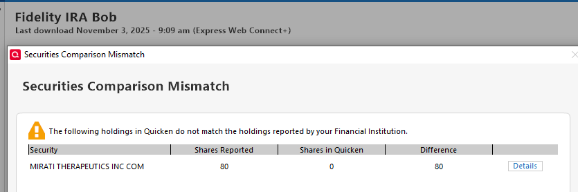 There's been no issue with this for the past few downloads, but today I got a Securities Comparison Mismatch, with 80 shares reported in the download compared to zero shares in Quicken.