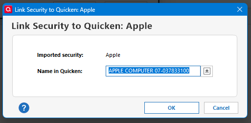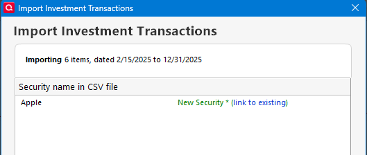 When importing using QIF Quicken imports by matching the security name. When importing by QFX Quicken matches using the CUSPID. In the case of the CSV it is matching by security name. But being Quicken instead of an external program it knew what to do with "Apple" as the security (from their example). It didn't create a new security it matched that I already had in my data file by allowing me to pick it using the (link to existing) below: